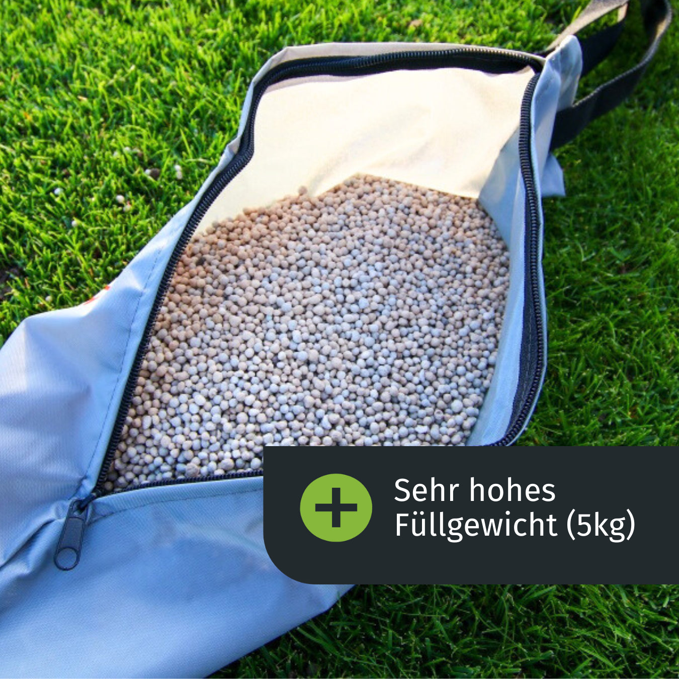 Den Reißverschluss öffnen und das Granulat außerhalb der Rasenfläche einfüllen. Im Idealfall das Granulat passend für die Fläche abwiegen, um Überdüngung zu vermeiden. Den Sack nicht zu stark befüllen.